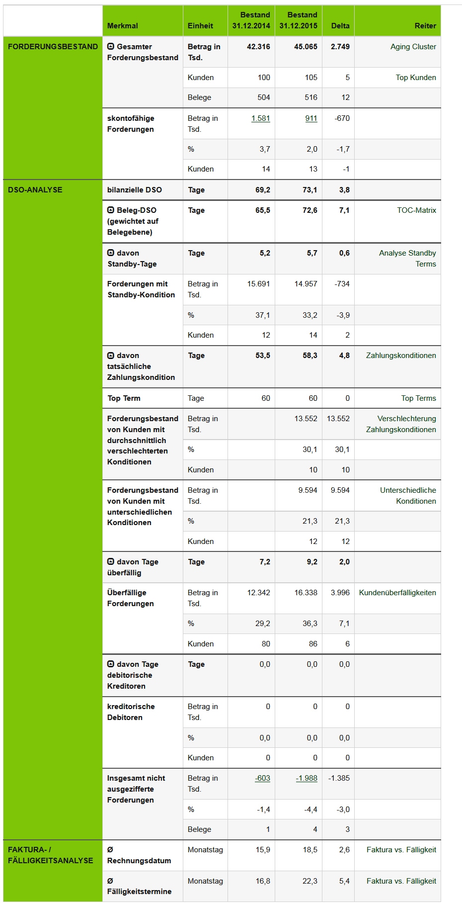 Sie erhalten zunächst und sehr schnell einen ersten Einblick in die Potentiale, die in Ihrem Working Capital schlummern, sowie einen unmittelbaren Überblick über die wichtigsten Kennzahlen und Key-Findings zu den betrachteten Stichtagen. Sie erkennen sofort auf hochaggregierter Ebene die Treiber, die z.B. für die Entwicklung der bilanziellen DSO, DPO und DIO verantwortlich sind.